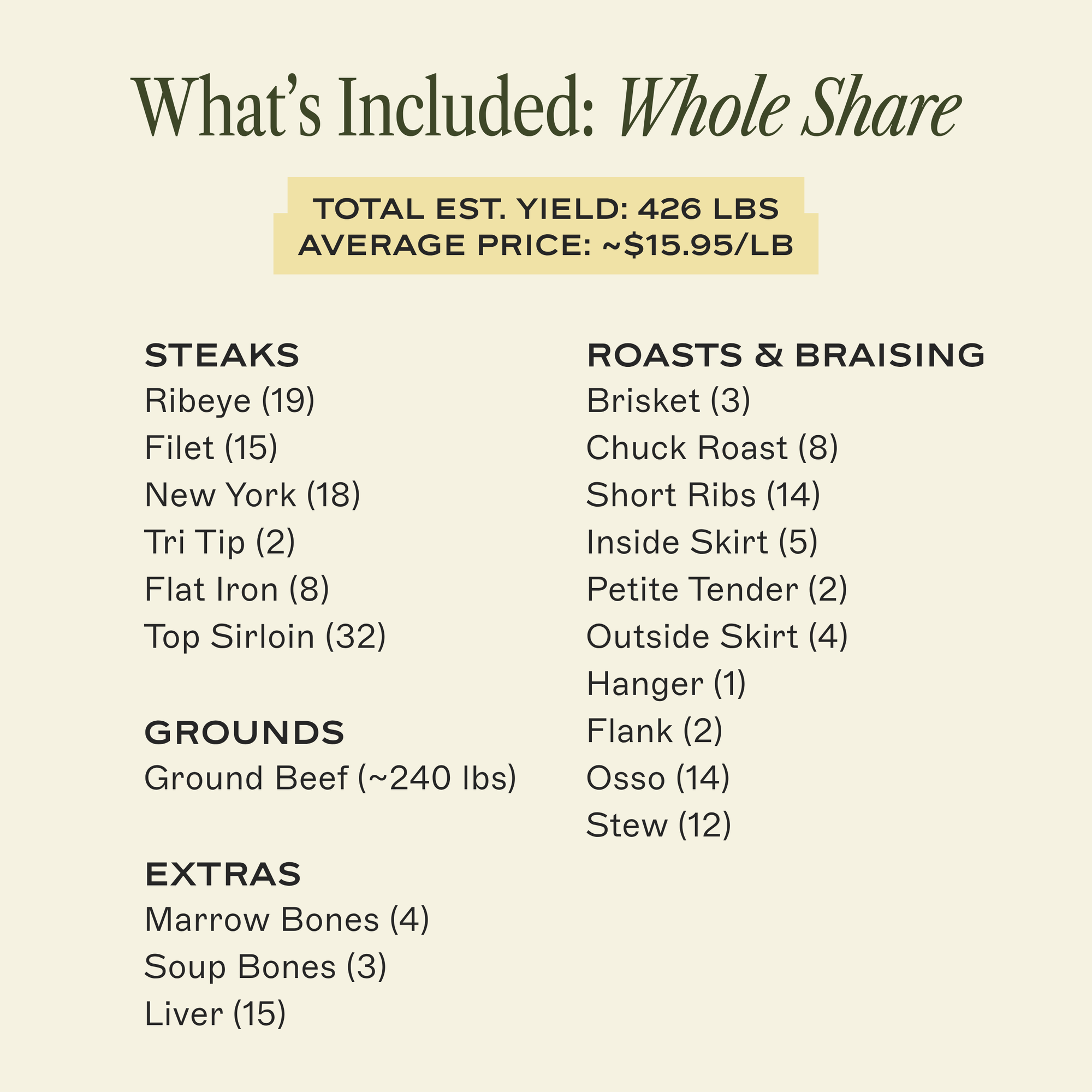 Your share includes every cut from your portion of the animal, premium steaks and everyday staples, averaged into one price per pound.