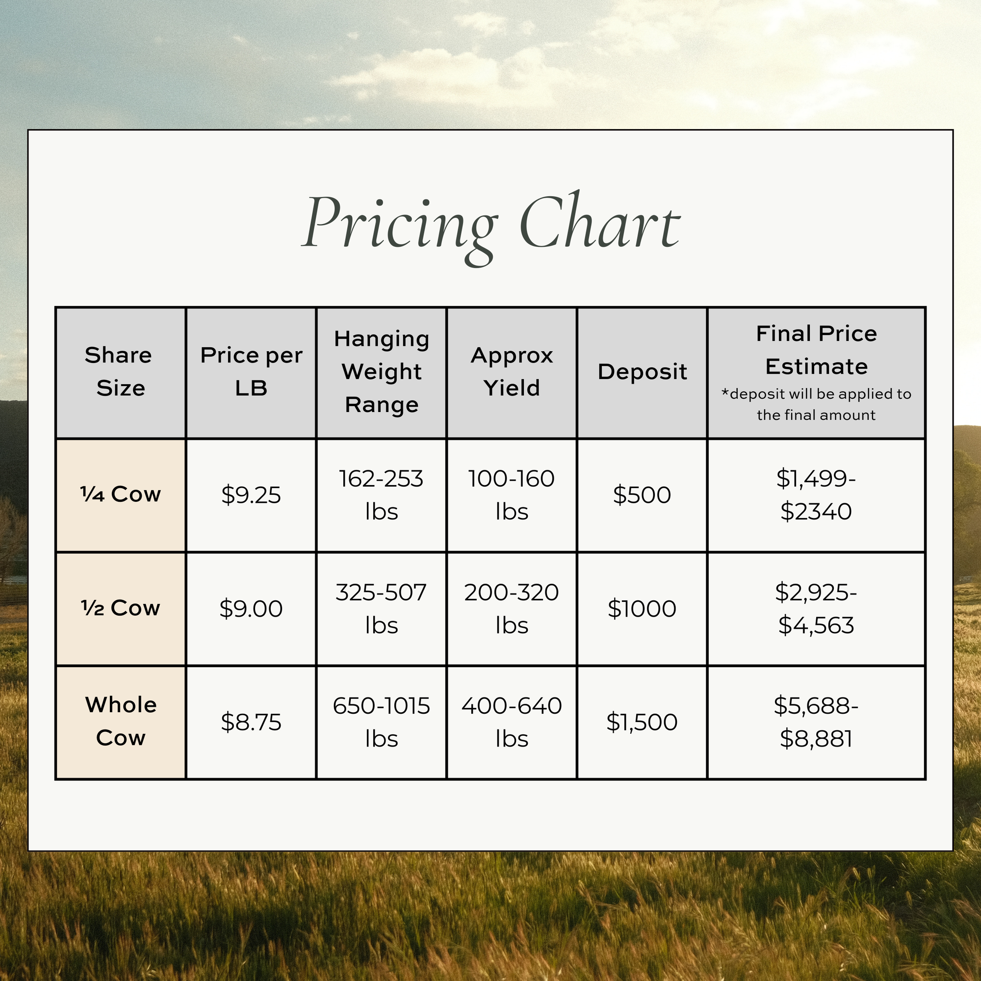 All deposits are non-refundable. Your deposit goes towards the raising and processing of your cattle share and will be credited to your final amount due. We appreciate your understanding and support!